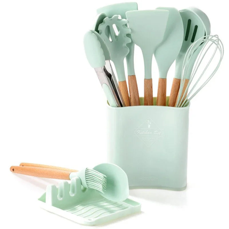 13Pcs Silicone Cooking Utensils Kitchenware Non-stick Cookware Spatula Egg Beaters Shovel Wooden Handle Kitchen Tool Accessories