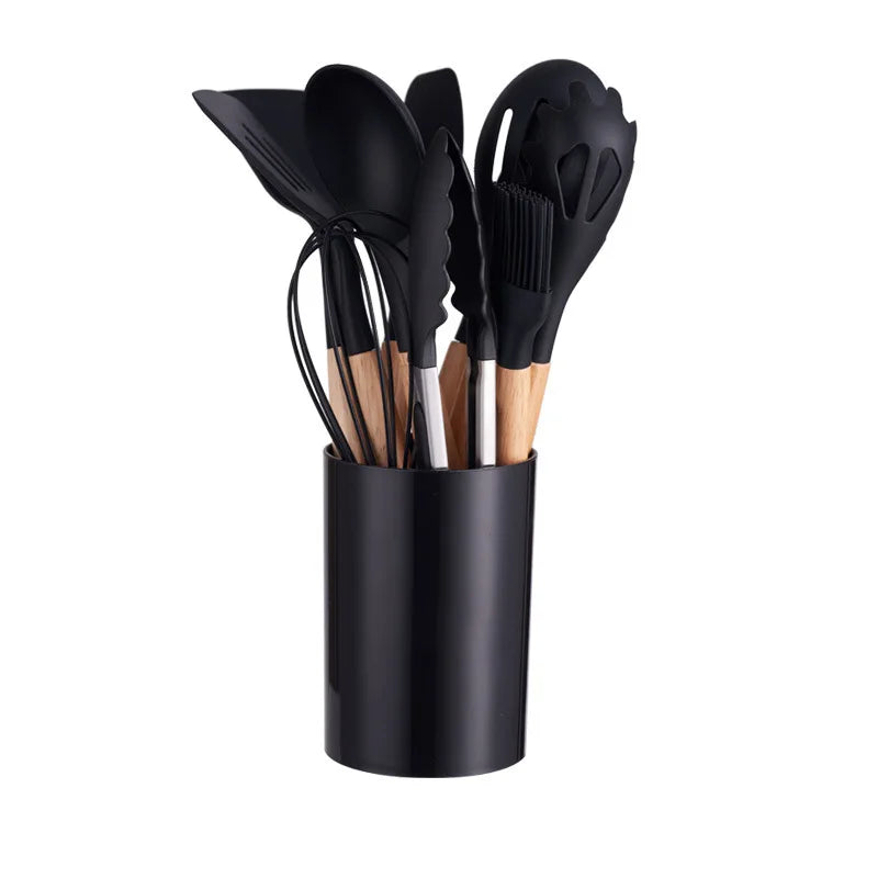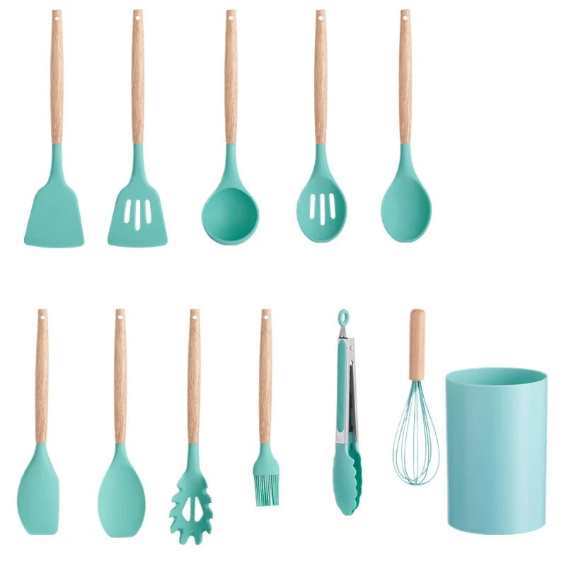 Silicone Kitchenware with Wooden Handle12Multifunctional Cooking Spoon Spatula Soup Spoon Nordic Kitchen Utensil Set with Storag